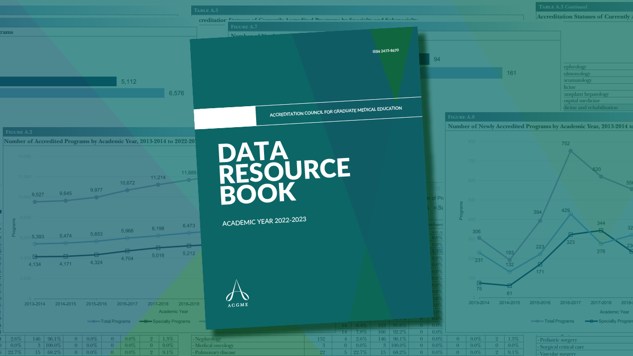 The ACGME is proud to announce the release of the latest edition of its Data Resource Book. This comprehensive resource providing the graduate medical education (GME) community with the latest GME data covers the period from July 1, 2022, to June 30, 2023.