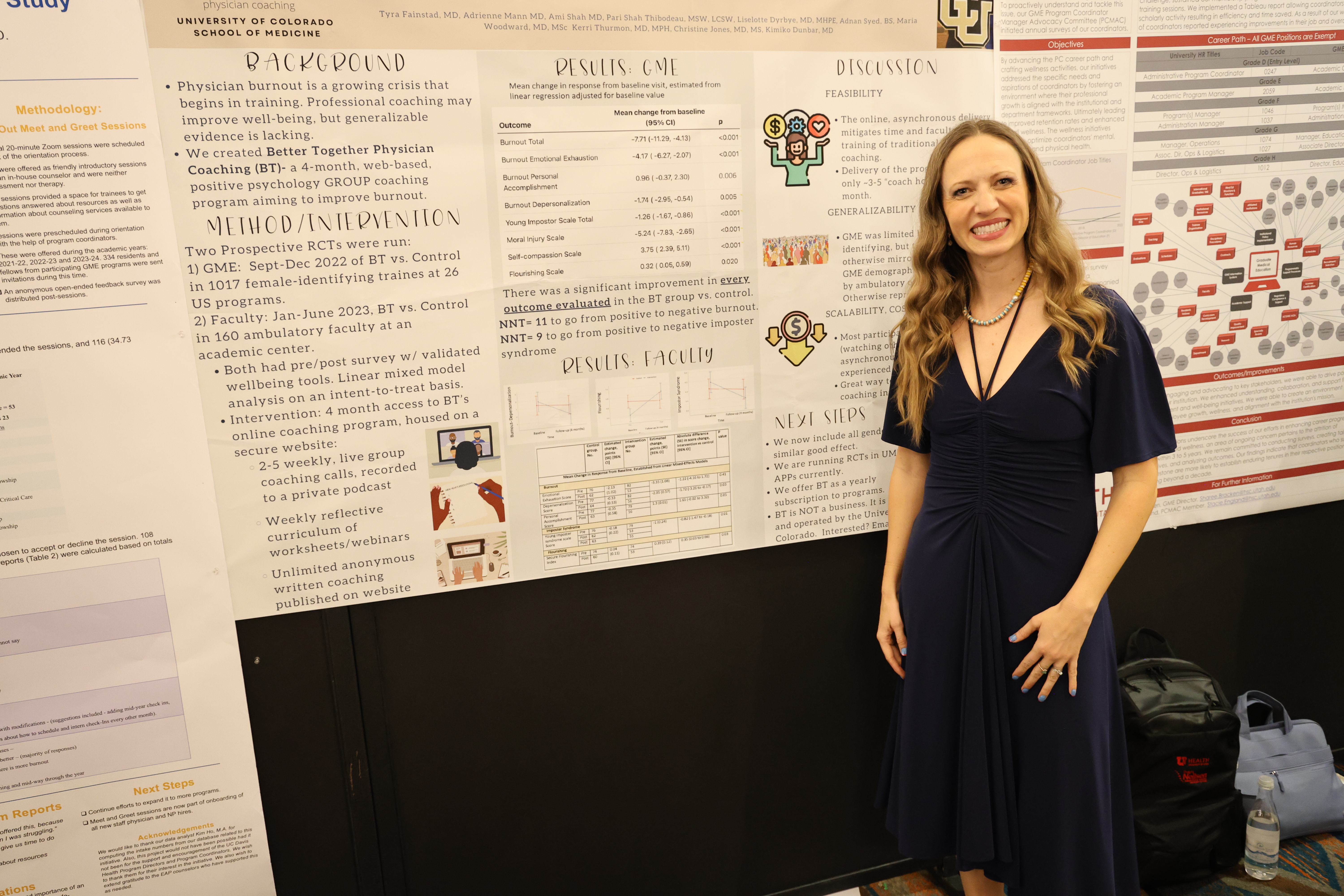 Dr. Fainstad: This abstract describes our two most recent randomized clinical trials of the coaching program, Better Together Physician Coaching. The first trial occurred with more than a thousand women physician learners across 26 GME programs in the US. We randomized learners into either an intervention group, which was offered our online program in the fall of 2022, or to a control group, which was not offered the program until the spring of 2023, after the study had ended. We measured metrics of well-being in both groups. After the coaching program, the intervention group had improved in every single outcome we measured! This is the largest and most effective study of a well-being intervention we are aware of, and we are so thrilled to disseminate these results.